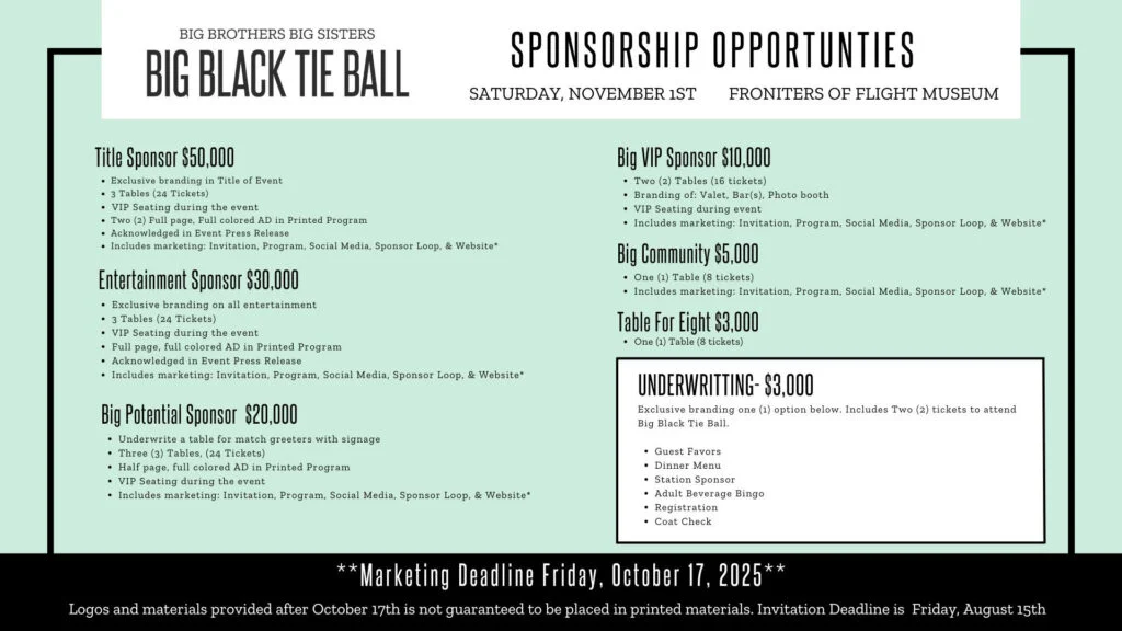 The 28th Annual Big Black Tie Ball chaired by Bob and Gina Gendron will be a night of celebration on November 1st at the Frontiers of Flight Museum. Join us as we celebrate our mission and the incredible services Big Brothers Big Sisters provides children to help them achieve their fullest potential through the power of one-to-one mentoring.